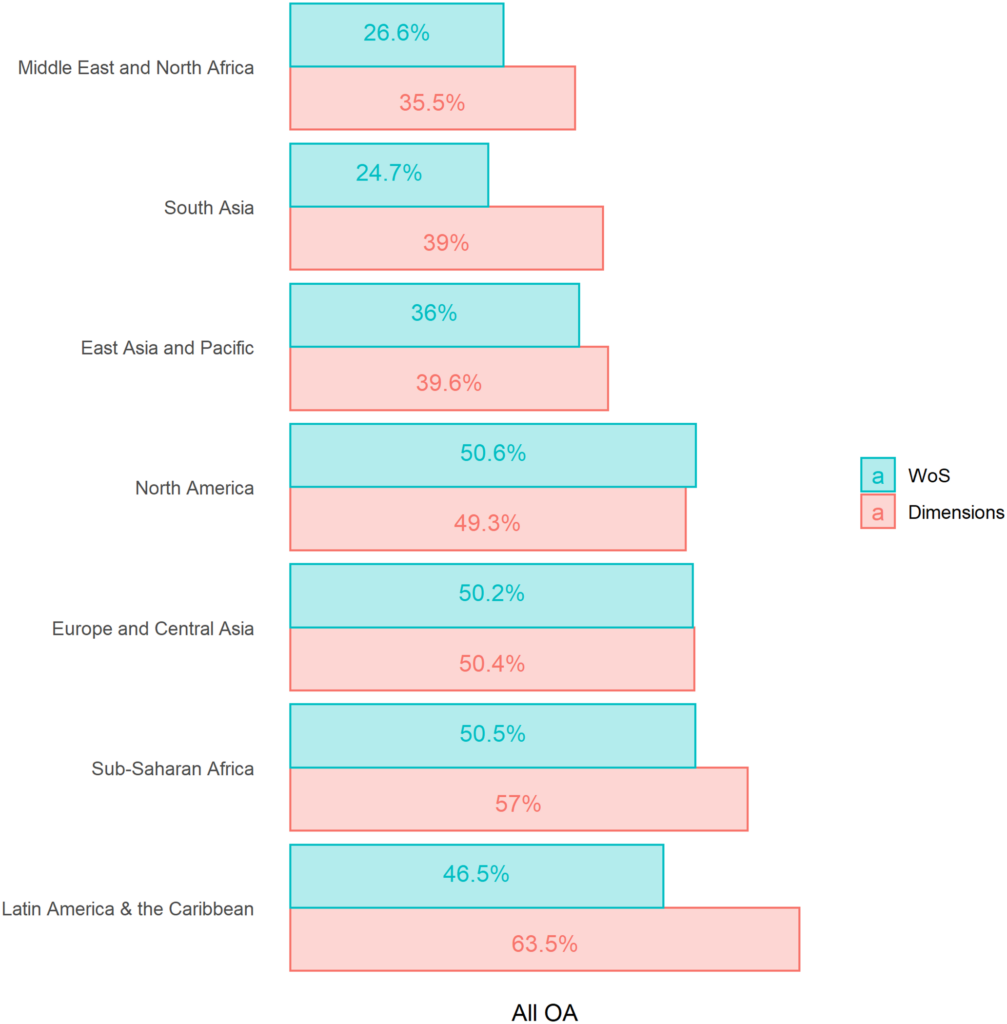 “For developed regions (Europe & Central Asia, North America), the percentage of OA publications is similar in both WoS and Dimensions. For all the other regions—which correspond to less developed parts of the world—, the percentage of OA publications in Dimensions are significantly higher… especially for South Asia (+57.9%), Latin Americas and the Caribbean (+36.6%), the Middle East and North Africa (+33.5%) and, to a lesser extent, Sub-Saharan Africa (+12.4%).”