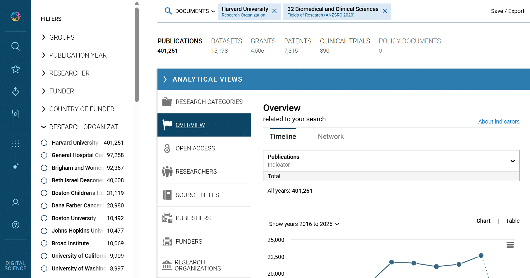In addition to the analytical views available in Dimensions, we offer a robust API that shows and exposes more of our connected data. With the help of the API, you can: