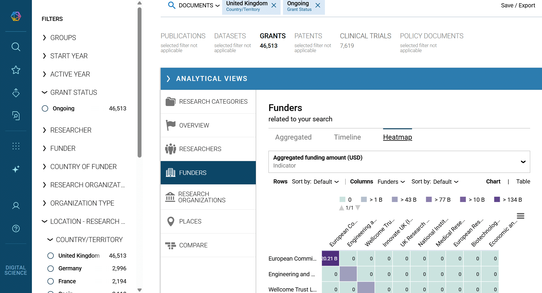 Dimensions uniquely provides funding data on active grants, allowing publishers to discover future volume of possible articles or authors. Funding data can also help you to identify well-funded research programmes by subject area at institutions with upcoming high-impact papers.