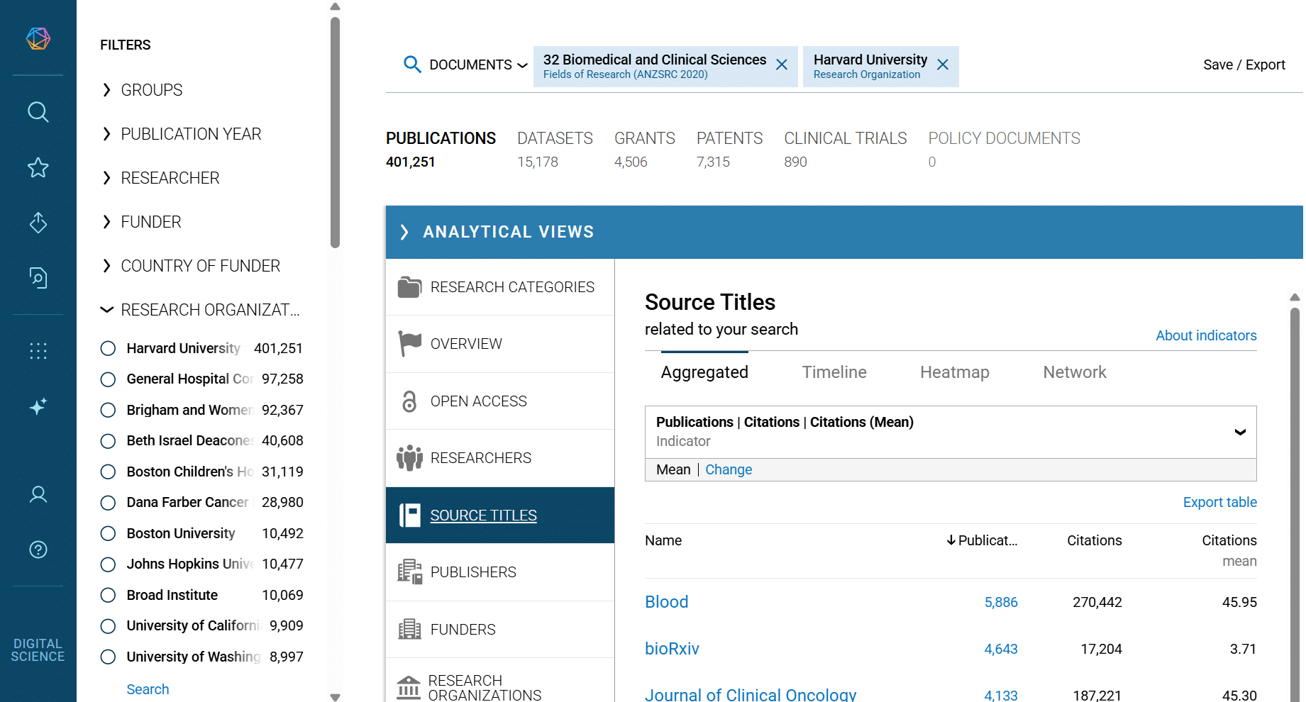 - Map the broad impact of publications: connecting funding data to publications and resulting citations, policy document mentions, patents and clinical trials