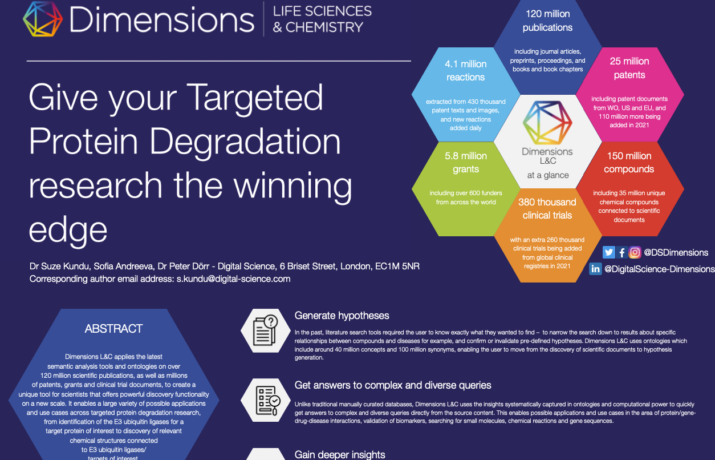 A poster showing how Dimensions Life Sciences & Chemistry can support and accelerate Targeted Protein Degradation research.