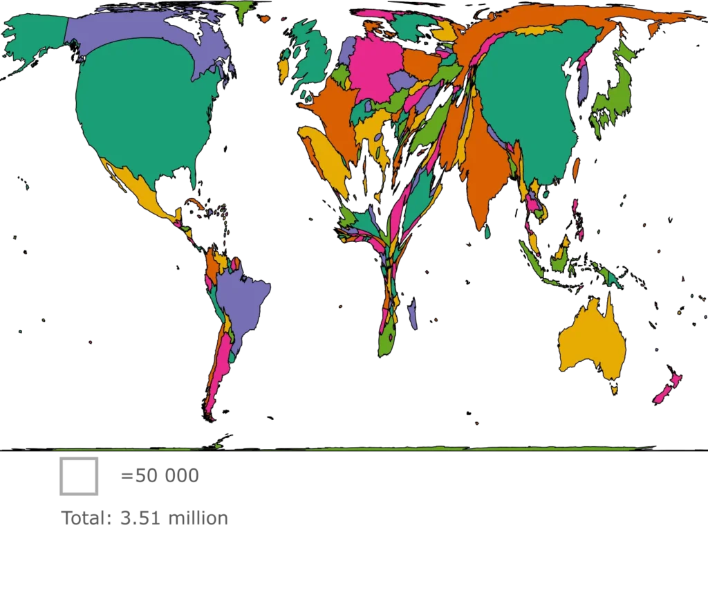 - Geography ready: One common challenge in data analysis is the unification of country names when merging geographic data. GRID, available in GBQ, uses the alpha-2 country coding scheme, facilitating seamless integration with external datasets and tools like the cartogram application used in this analysis https://go-cart.io/cartogram and standard plotting analysts libraries.