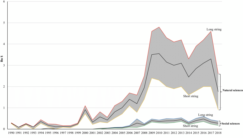 To make their case, the authors analyzed a dataset derived from Dimensions that comprised research grants from 1950 to 2021, spanning 4.3 million awards with a cumulative budget of USD 1.3 trillion. Their results revealed that in the period between 1990 to 2018, the natural and physical sciences received a total of USD 40 billion compared to only USD 4.6 billion for the social sciences and humanities. And of all research funding, only a minuscule 0.12% was spent on the social science of climate mitigation.