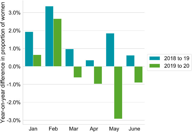 The bar chart shows the percentage change in the number of women appearing as co-authors on papers in global output.