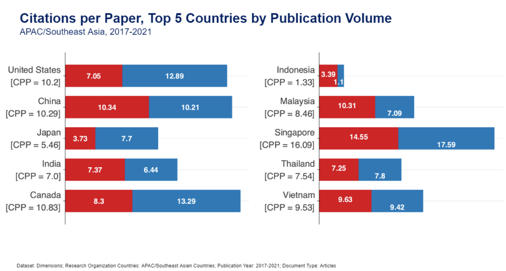 We examined average citations per paper across the top five countries by publication volume in APAC and then the top five countries by publication volume in SE Asia. Given the rise in OA, the number of closed average citations a country has should be indicative of average OA citations. Yet we found this wasn’t always the case; Indonesia is a clear example of this.
