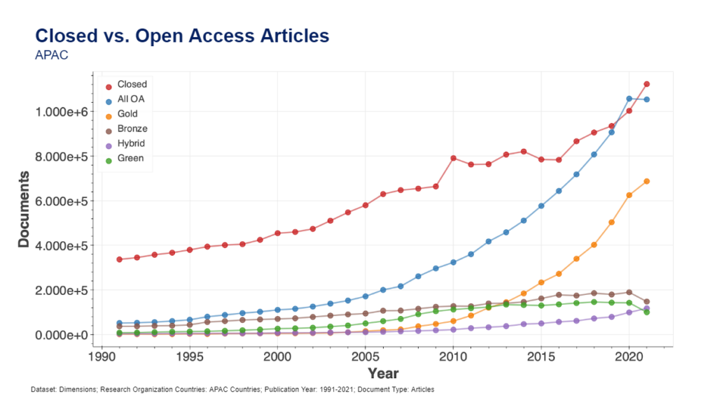 MK: There has been a huge shift to OA publication models in recent years. We wanted to delve into this further and get a comprehensive view of OA in Asia-Pacific (APAC) and Southeast (SE) Asia. First, we tracked the number of closed and open access articles published in the APAC region over the past few decades. This initial analysis uncovered exponential growth in OA publishing; in fact, in 2020 the share of articles openly published overtook those published under the traditional closed access model.