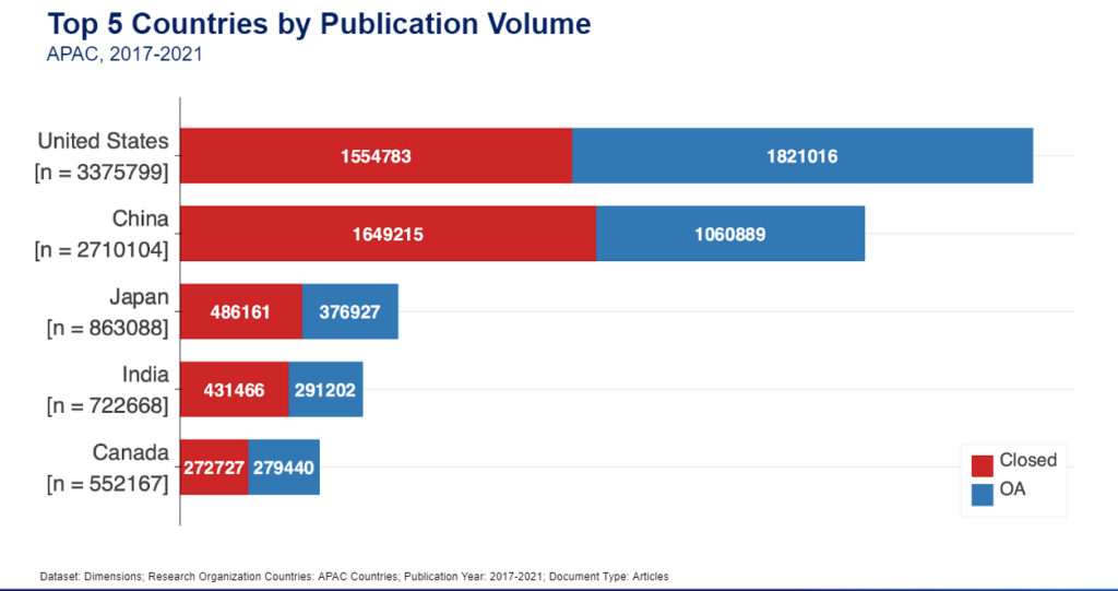 AS: We then scrutinized the data to gain a more nuanced understanding of these publishing trends. Analysis of the five countries with the highest overall research output from 2017 to 2021 revealed that the ratio of closed to open access articles being published is somewhat comparable. There has been great uptake of OA in these leading research countries, particularly in the United States and Canada.