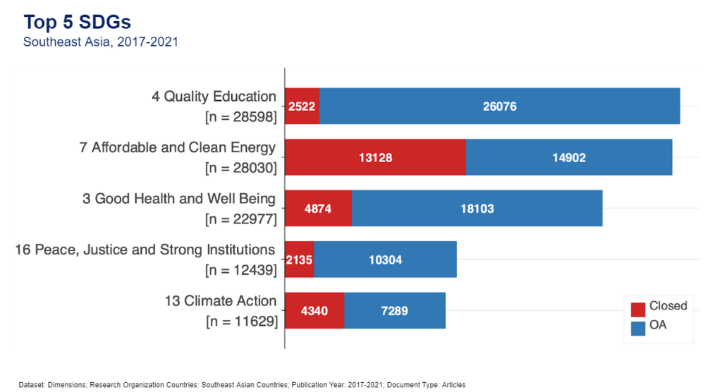 MK: Looking at SE Asia, the focus is a little different. Affordable and clean energy still ranks high, but quality education is the priority. Much of this relates to Indonesia’s publishing activity. Moving forward, many more SDGs will need to be addressed by research at this level. I expect clean water to be a top priority in the coming years, as well as sustainable cities. The cities of SE Asia are set to grow and more will be developed. As this happens, this SDG will emerge more strongly.