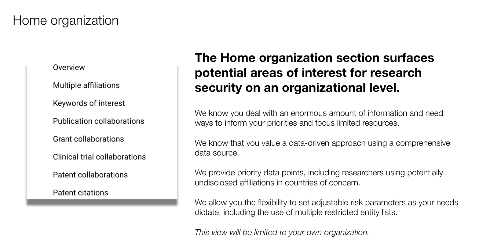 Dimensions Research Security is the trusted solution built to meet the distinct needs of academic institutions and government agencies. It provides unmatched visibility into researchers’ global connections, helping institutions stay audit-ready, protect reputation, and make confident compliance decisions with speed and precision.