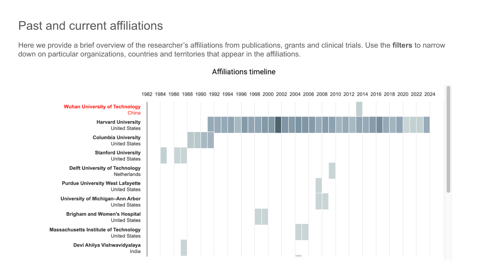 Access a full picture of international affiliations, collaborations, and funding relationships across publications, patents, grants, and clinical trials.
