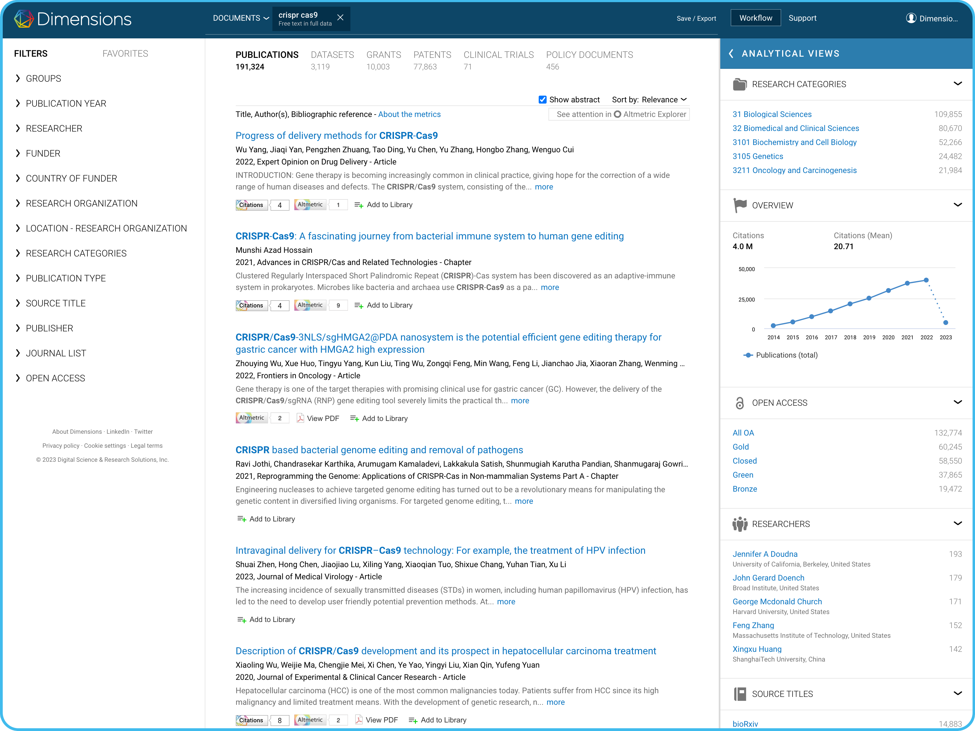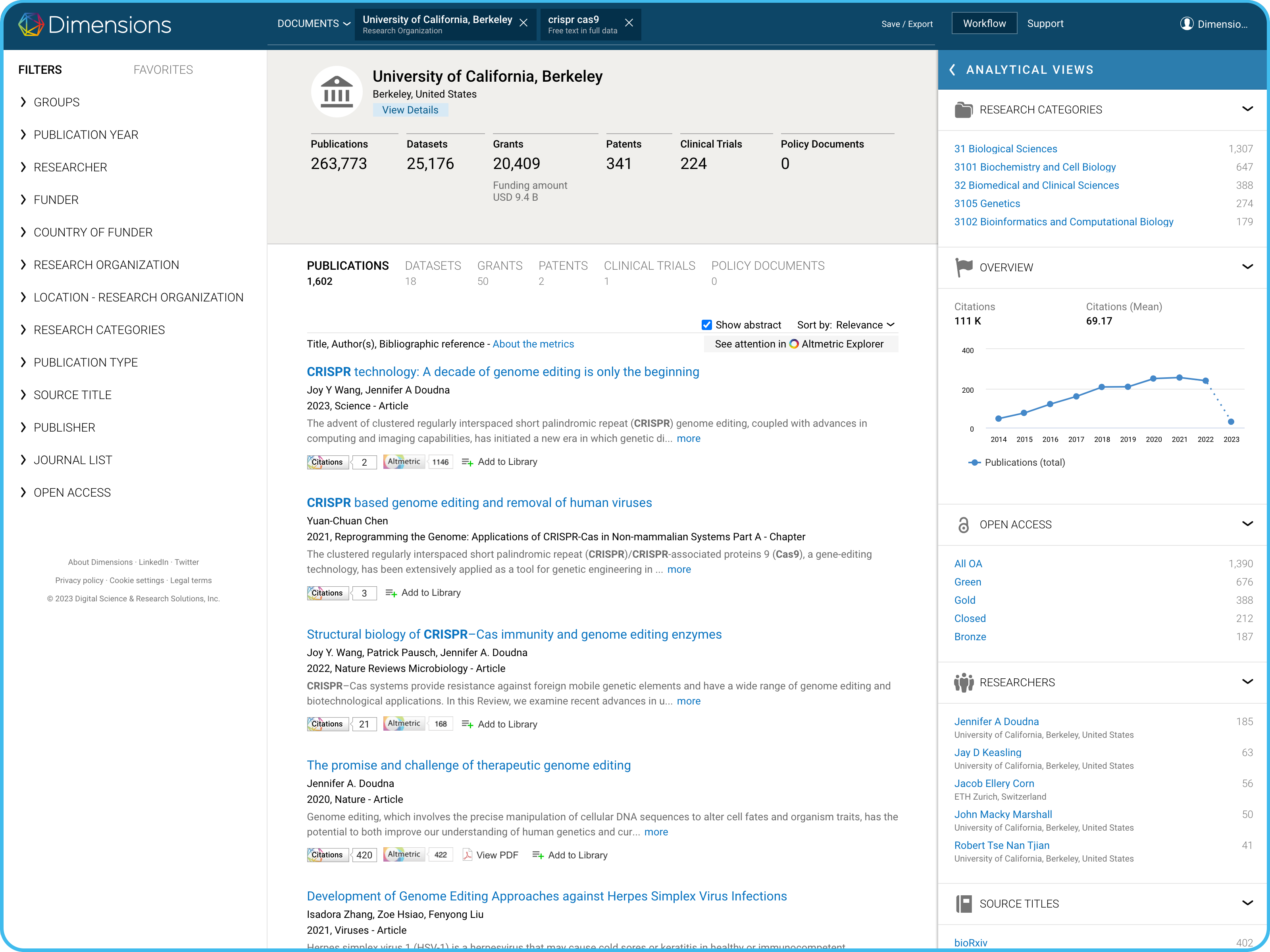 With Dimensions Analytics, you can access global research data from one place. Dimensions interlinks research data across multiple publications, clinical trials and grants, allowing you to conduct comprehensive, quality research.