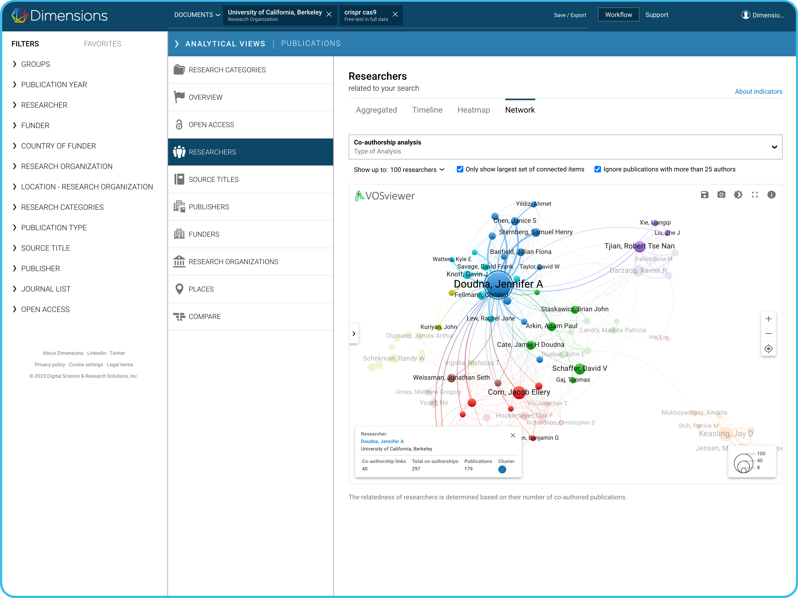 Identify key researchers, organizations, and funders in your field, and explore their connections with the integrated VOSviewer module.