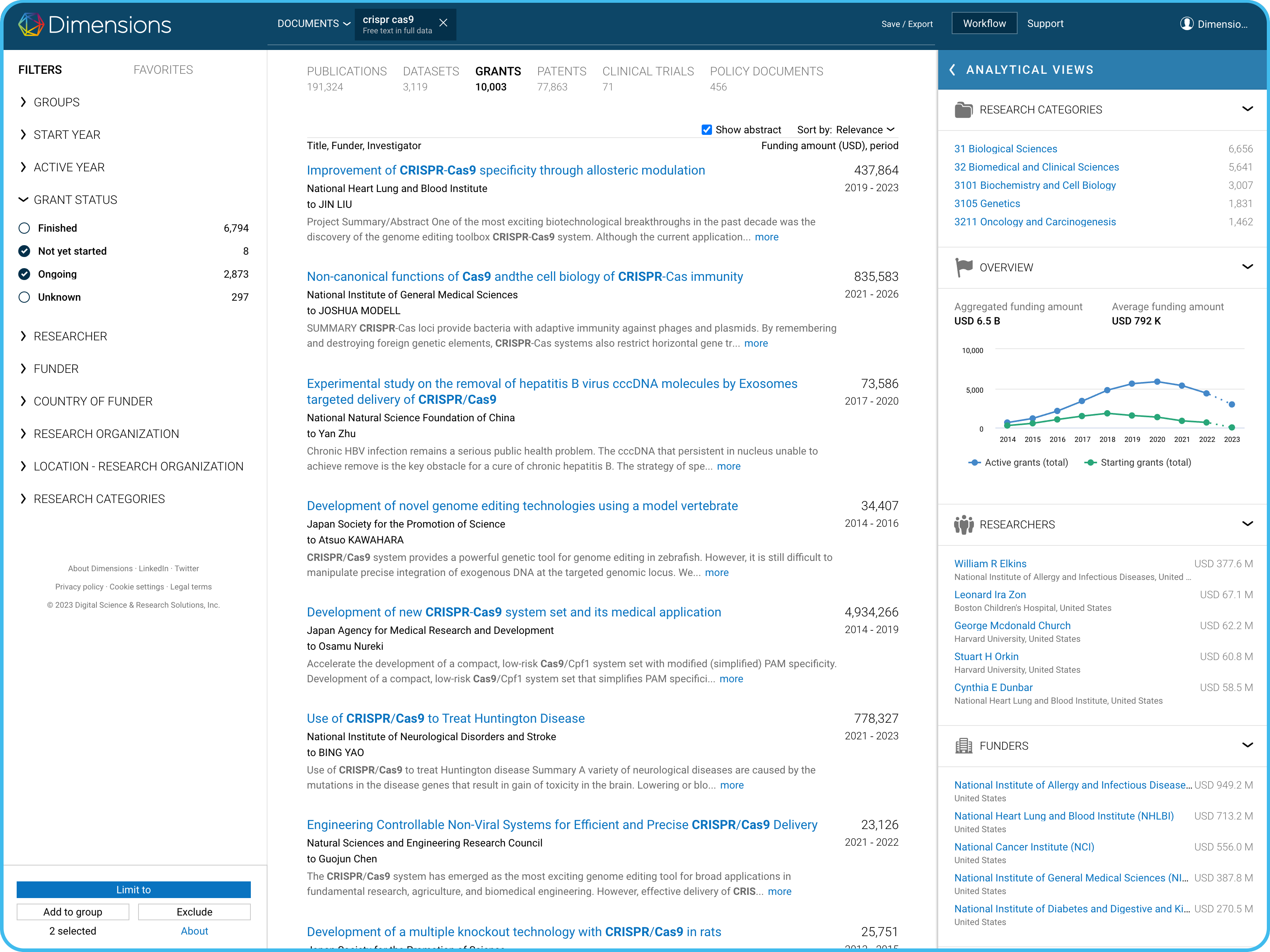 Use search-based analytics to find millions of quality grants and publications for multiple industries, from corporate and academic R&D teams to healthcare and research institutions. Through our platform that interlinks data, we provide robust search capabilities for in-depth research on different topics, going beyond queries and summaries to provide detailed overviews and full texts.