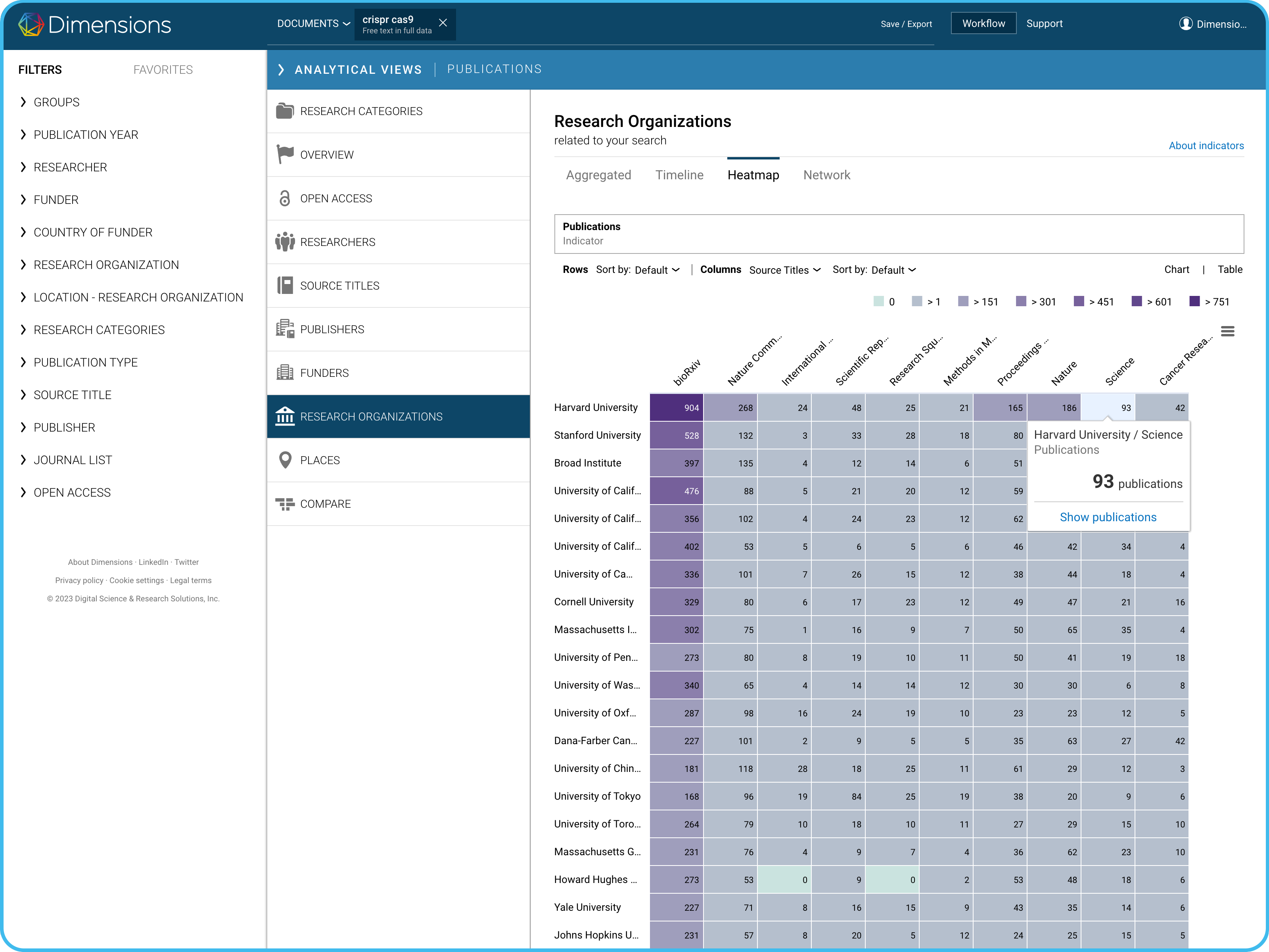 Dimensions Analytics provides a broad scope of research data, interlinking data from publications, patents, policy documents and clinical trials. With a robust library of interconnected information enhanced with data visualization, API solutions, AI capabilities and more, you get access to quality reports for every query you may have.