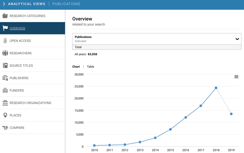 A quick look at the publications over the last 10 years in Dimensions reveals more than 1 million CAR-T related publicationsconfirming it’s a trending field of research and the analytical views tab indicates increasing academic impact based on citations.