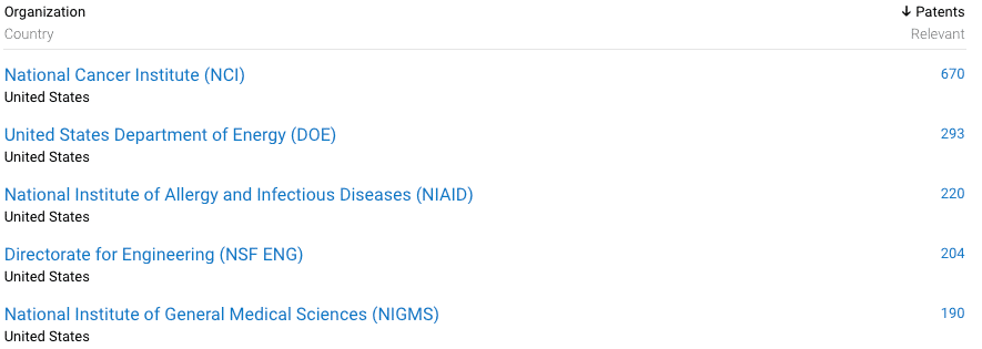 The analytical views tab makes it simple to identify the top funders in the field and the results are consistent with indicators, in that much of the research is being led by the US with more than 670 patents from the National Cancer Institute alone.