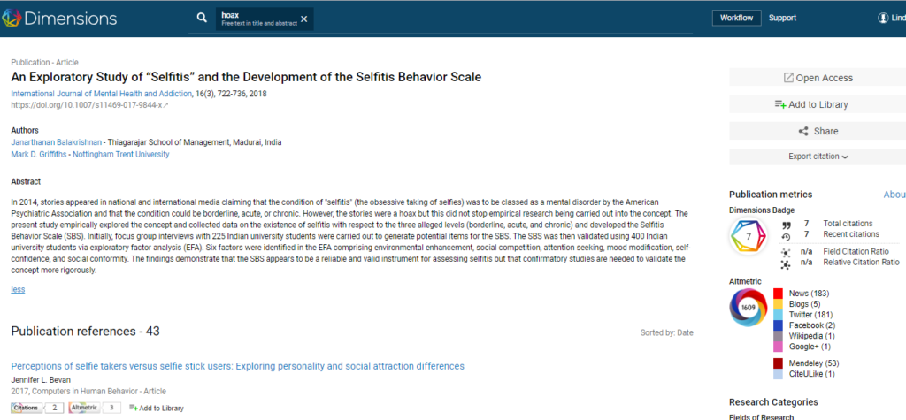 Figure 1: A screenshot of the article “An Exploratory Study of “Selfitis” and the Development of the Selfitis Behavior Scale” in Dimensions.