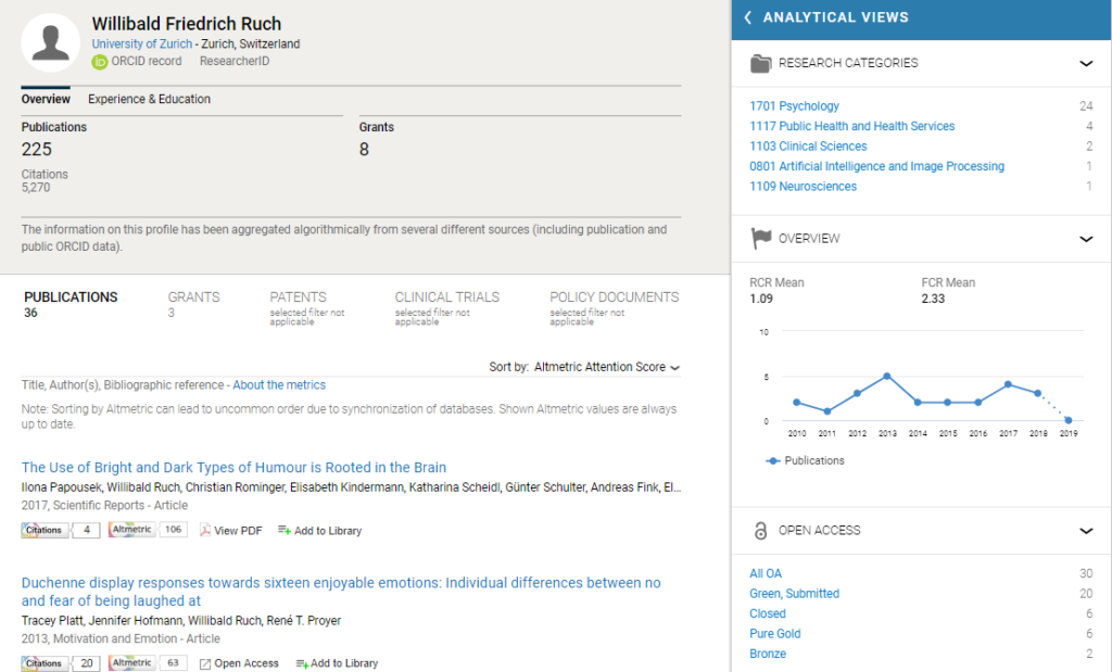 In Dimensions, publications are linked to other content types to provide a full view of the research landscape and easy exploration of the connections between relevant grants, clinical trials, patents and policy documents. A look at Professor Ruch’s profile page shows he has also been awarded three grants for research into the topic, including nearly 200,000 euros from the Swiss National Science Foundation for The joyful face may hide an evil mind: Individual differences in fearing laughter – an investigation into the social and emotional context of laughter styles.