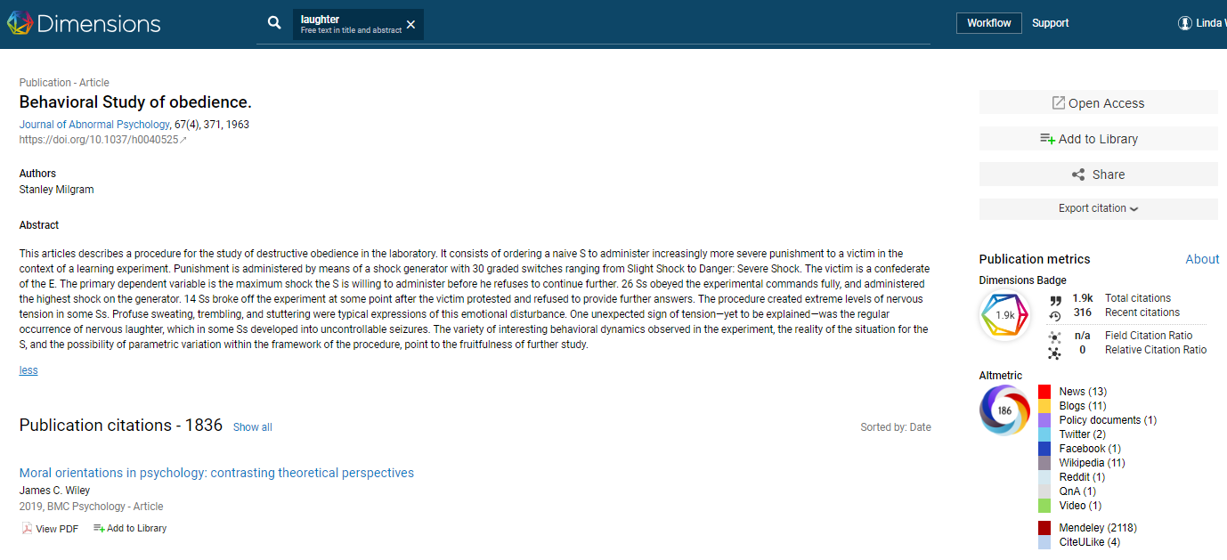 Figure 3: A screenshot of the article “Behavioral Study of Obedience” in Dimensions.