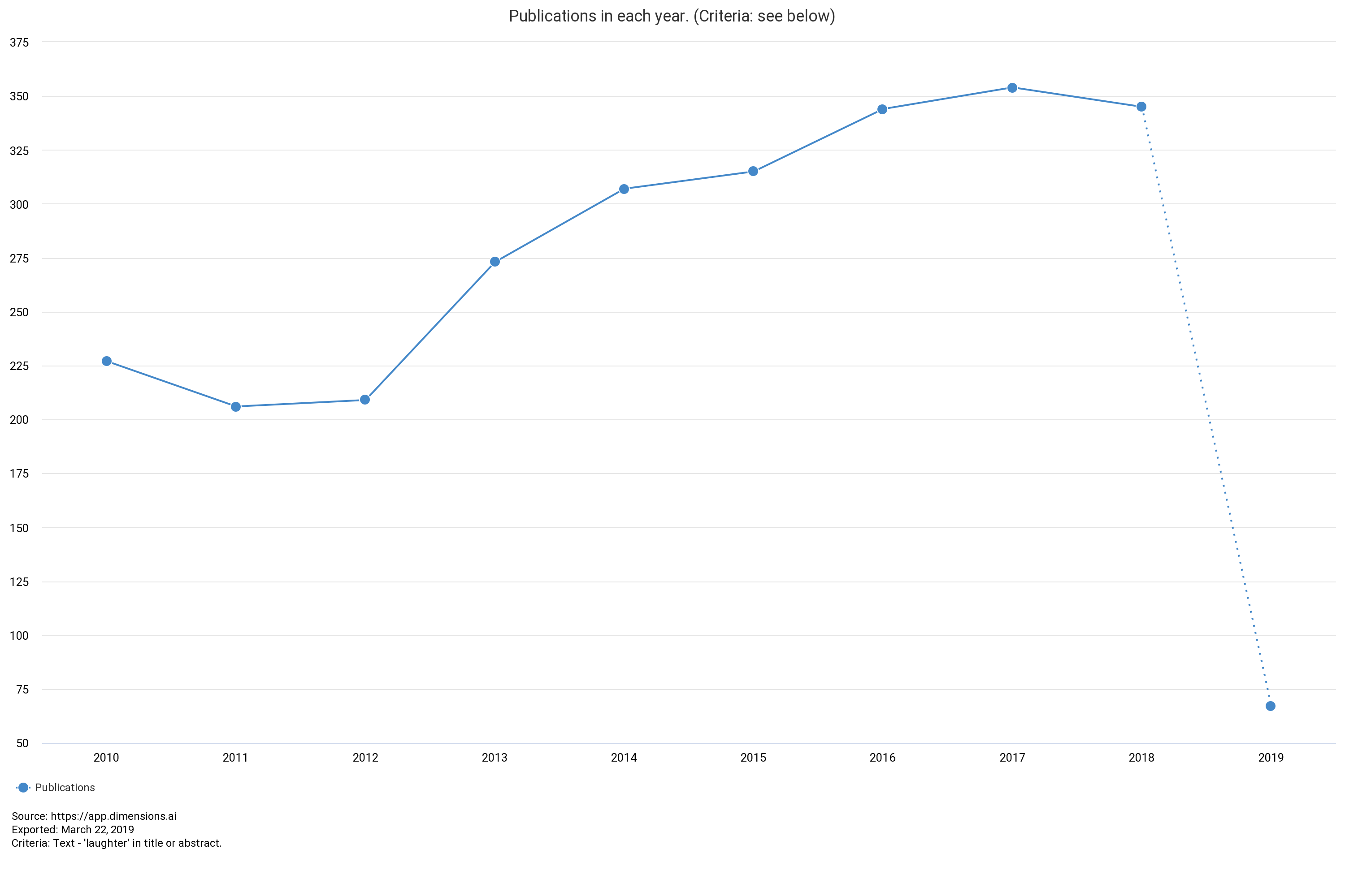 Publications related to laughter have been rising steadily in number over the past eight years – increasing from 227 in 2010 to 345 in 2018.