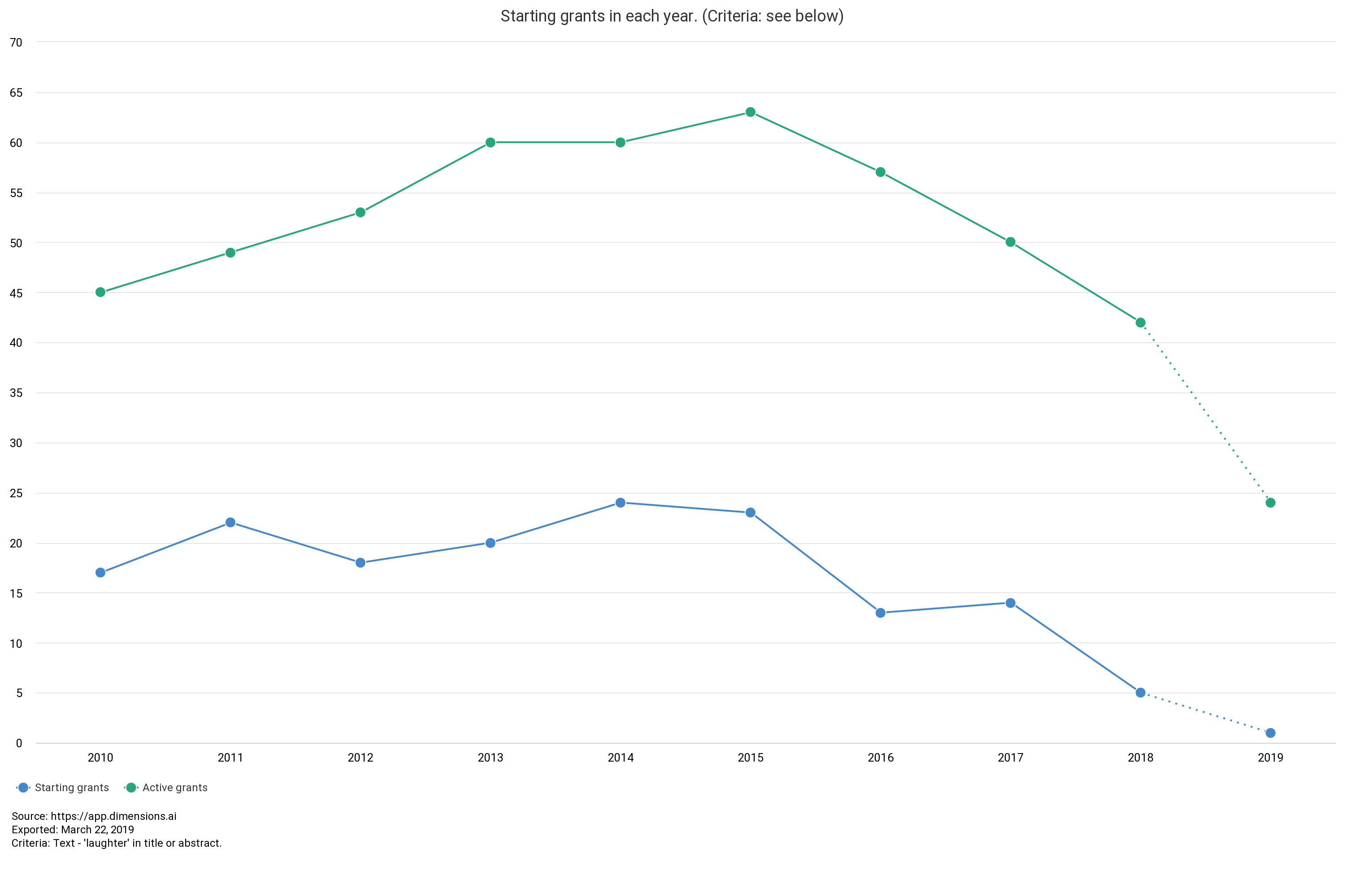 While publications may have peaked in 2018, as we can see in figure 5, active grant funding hit its highest point in 2015 – possibly an indication that we can expect the upward trend in laughter-related publications to continue in the short term. However, with the number of starting grants falling from a peak of 24 in 2014 to five in 2018, longer term, we are likely to see a drop in publication numbers.