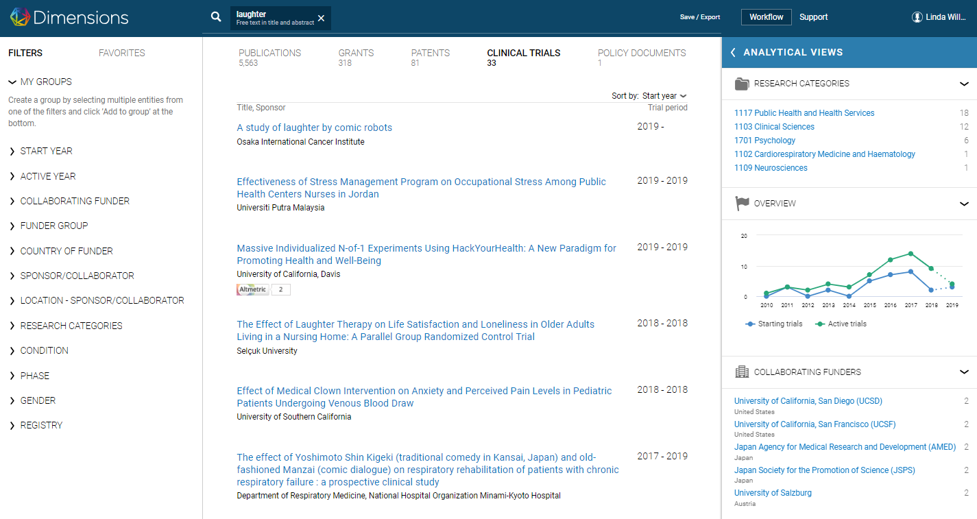 As we’ve seen in this article, there are many medical benefits associated with laughter, and there are 33 related clinical trials in Dimensions. The most recent of these is being run by the Osaka International Cancer Institute in Japan, and looks at whether comic robots can entertain oncology patients. Others look at the role of laughter in helping elderly people with loneliness, nurses with occupational stress, and pediatric patients with pain.