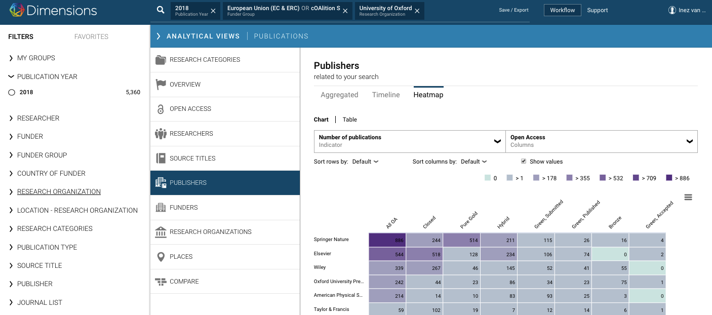 Importantly, these filters make it possible to select the group of funders behind cOAlition S (a list that users can customize to meet their needs). When this is applied in connection with other filters, such as Open Access type and publisher name, organizations can quickly and simply gain an overview of what Plan S might mean for them. For example, the screenshot below captures the publications from the University of Oxford in 2018, which acknowledge funding from cOAlition S funders in the different OA categories per publisher (including ‘closed’ for articles behind a paywall).