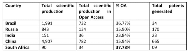 From the results presented, it is worth highlighting the proportion of production in Open Access, taking into account its relevance to balancing inequalities in the visibility of scientific production on a global scale. As we can observe, Brazil and South Africa appear as the largest producers of Open Access, much due to the success of Scielo’s presence in these countries.