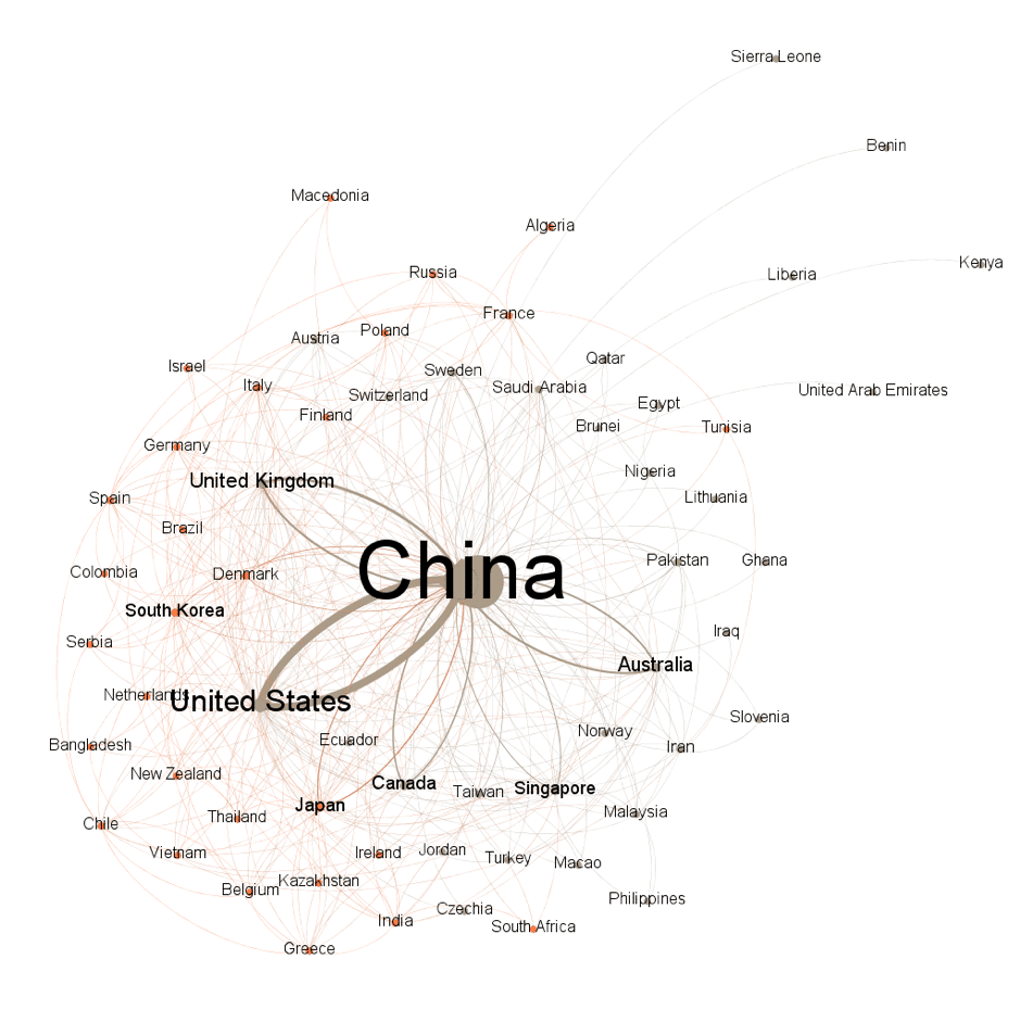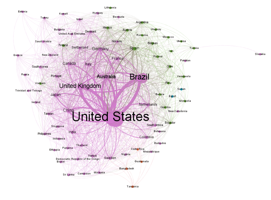 In the graph generated from Brazilian productions on climate change, it is possible to observe a centrality of the United States over the co-authorship network. One of the possibilities of analyzing network graphs of co-authorship is to draw inferences on the contexts behind the visualization generated. In the Brazilian case, it is important to emphasize a process of Americanization of science following World War II, as discussed by Haney, particularly during the Brazilian military regime, between 1964 and 1989.