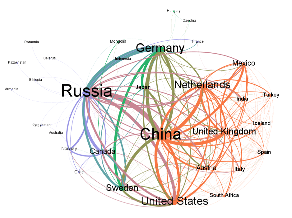 This network is in line with the findings of Glänzel on national characteristics in national co-authorship relations in several countries. According to his study, Glänzel noted that Germany proved to be a very important partner for most countries, especially for Austria, Hungary, Poland, and Russia, while Russia presents itself as an important partner for several Eastern and Western European countries. Although the findings of Glänzel, the network with Russia shows that this is a country of great diversity of articulation and interaction, becoming an important stakeholder both with Eastern and Western Europe, Asia, and North America, showing its potential of scientific influence and international articulation.