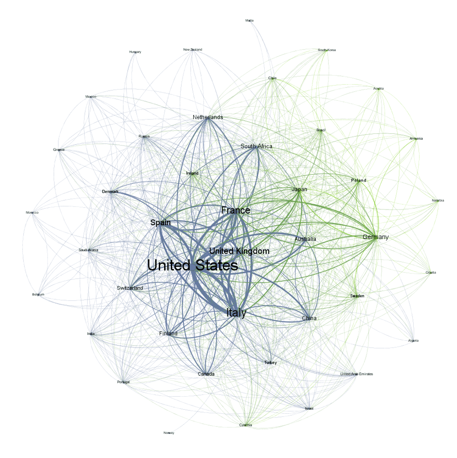 After the extraction of the raw data, the research networks were generated based on the worksheet generated by Dimensions. The categorization of the data for the formation of the co-author networks required processing through the R language, using IDE RStudio. Each article in the database contained information on the countries of their authors, who were reorganized in order to create relations between their respective countries, so that all the countries of the co-authors had connections between them. The Gephi software was used to visualize the co-authorship networks, in which each node represents a country and the edge is the link between these two nodes (countries).