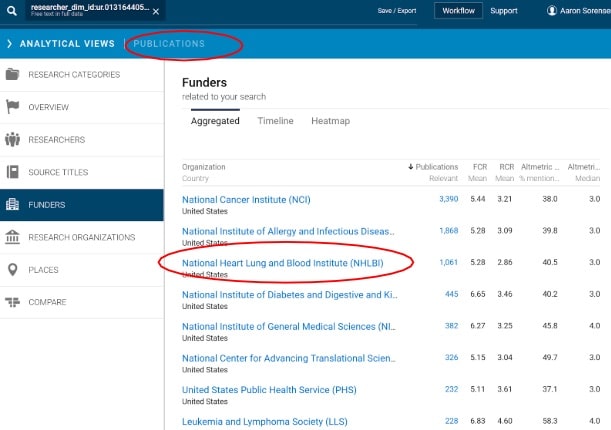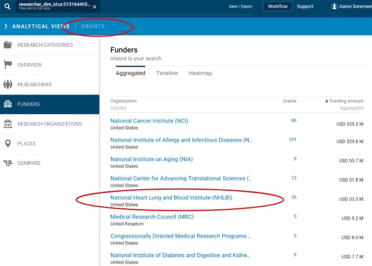 Dimensions allows you to seamlessly search across content types and easily filter by researcher in the grants database, comprised of 4 million grants and $1.3 trillion in funding. Taking a deeper look at the grants using the same generation of researchers, the analytical views tab displays the top funders related to the search.