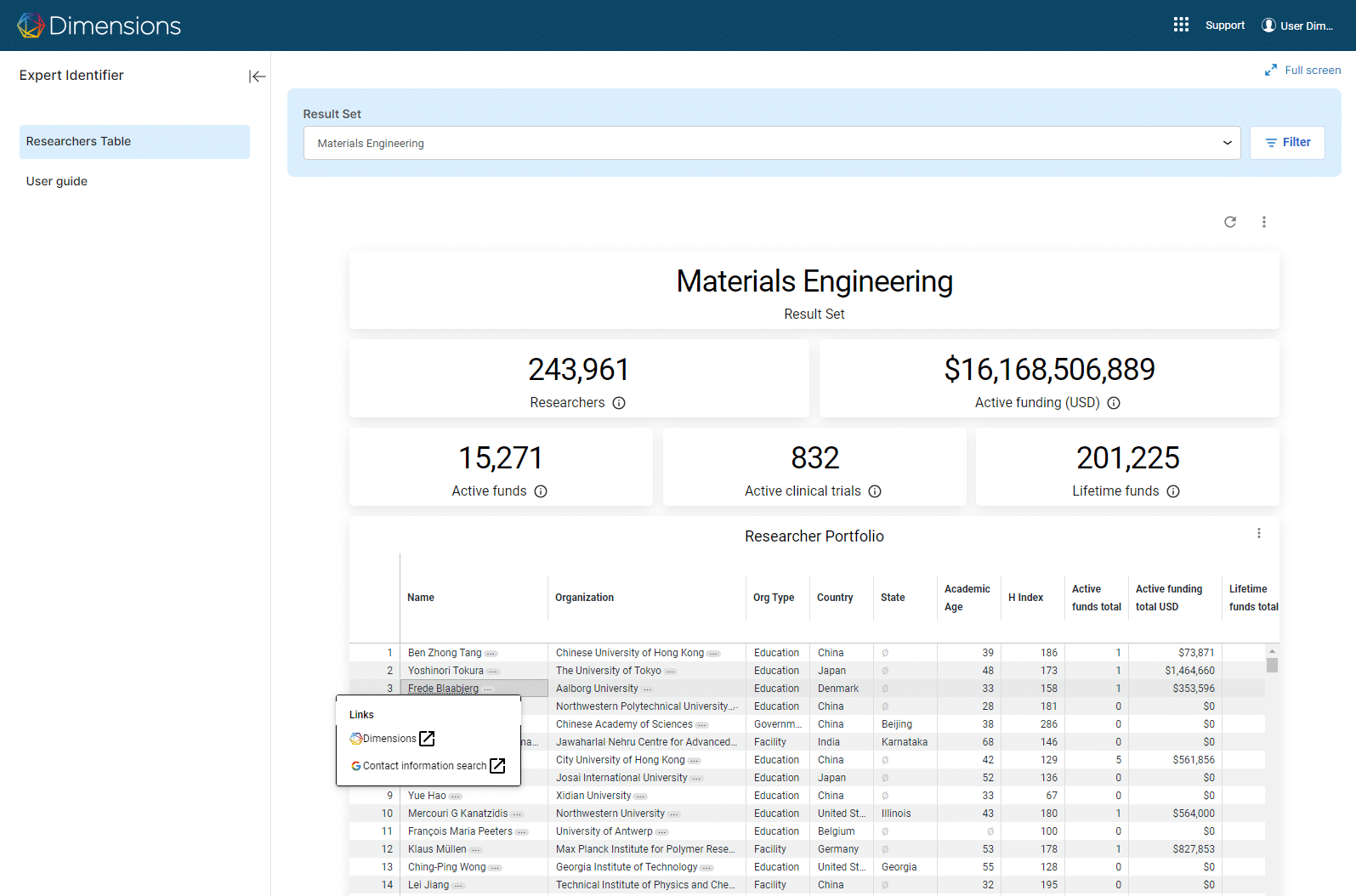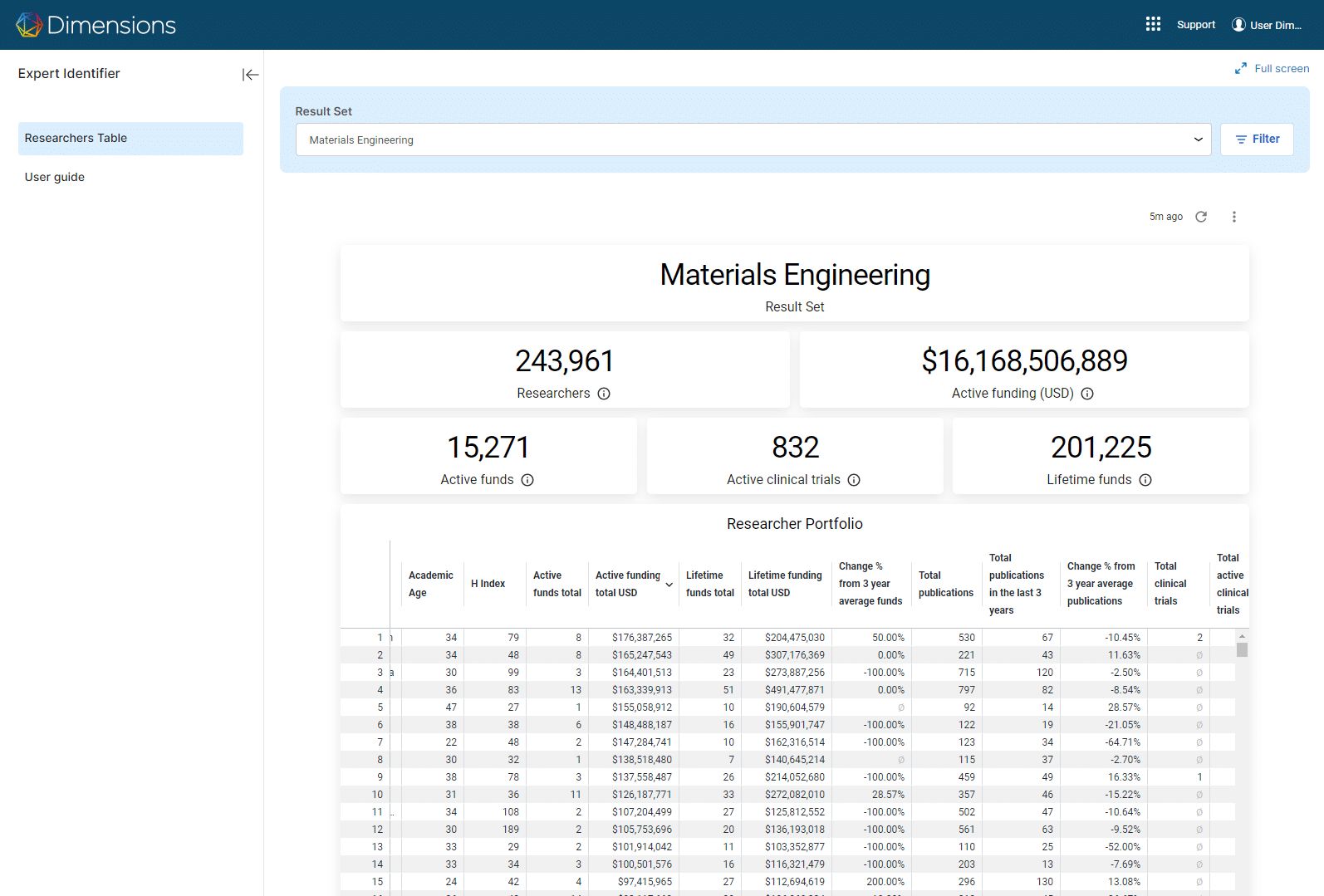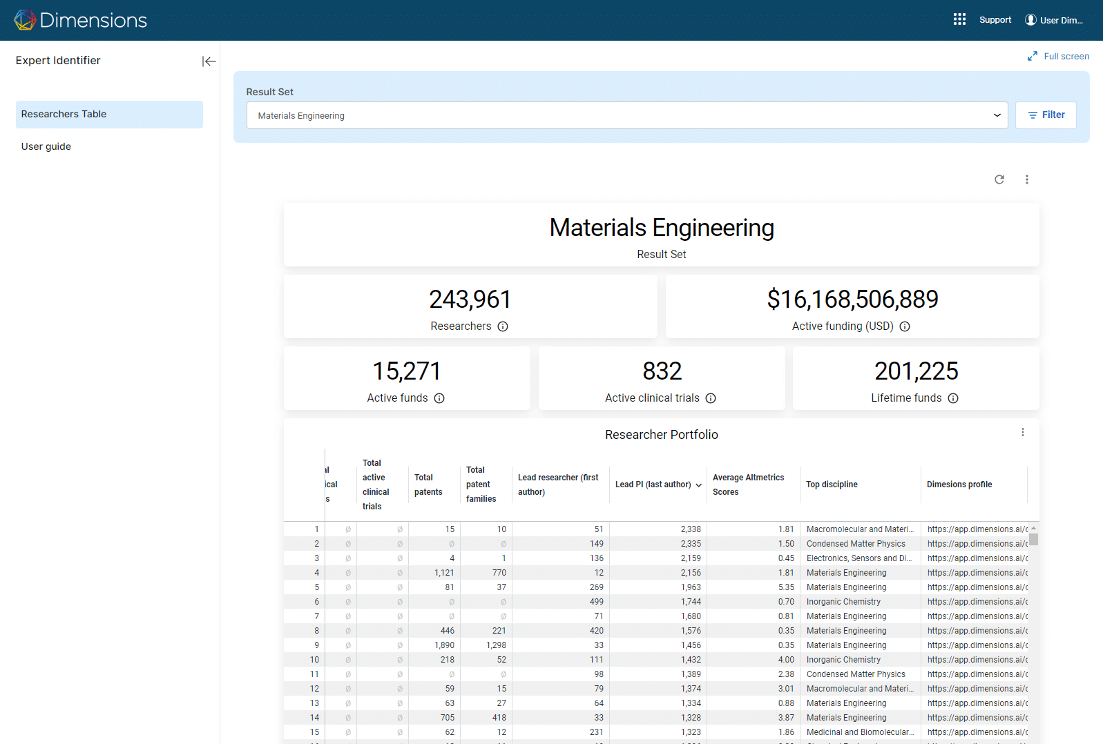 The Expert Identifier app gives you the most extensive list of researchers precisely matched to your business with additional analytical information not found anywhere else, to ensure your outreach is more strategic. Uncover the right experts for targeted decision-making in a specific research focus area. You can easily achieve that thanks to Dimensions’ unprecedented full-text search and largest collection of linked research data.