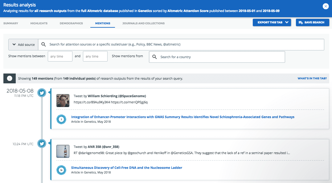Digging further into the data via the Altmetric Explorer platform enables you to pull out the attention that you are most keen to see – whether it’s examples of influence on public policy, attention from specific social communities, or academic interest from scholars in a particular field or part of the world.