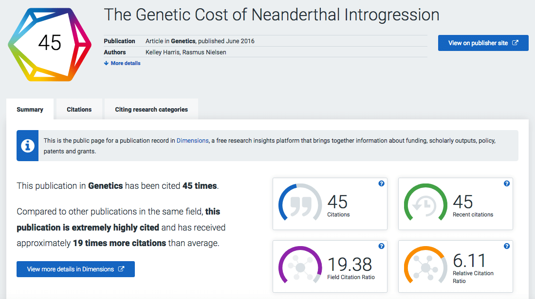 This one is easy. A quick search in even the free version of Dimensions will immediately show you the citation count and Altmetric Attention Score for any indexed publication. Those familiar with altmetrics will recognize the benefits that the immediacy of this data can bring – being able to track the online engagement surrounding a paper from the moment it’s published makes it possible to see how the paper is being received, provide more timely feedback to the authors, and inform things like further promotional efforts.