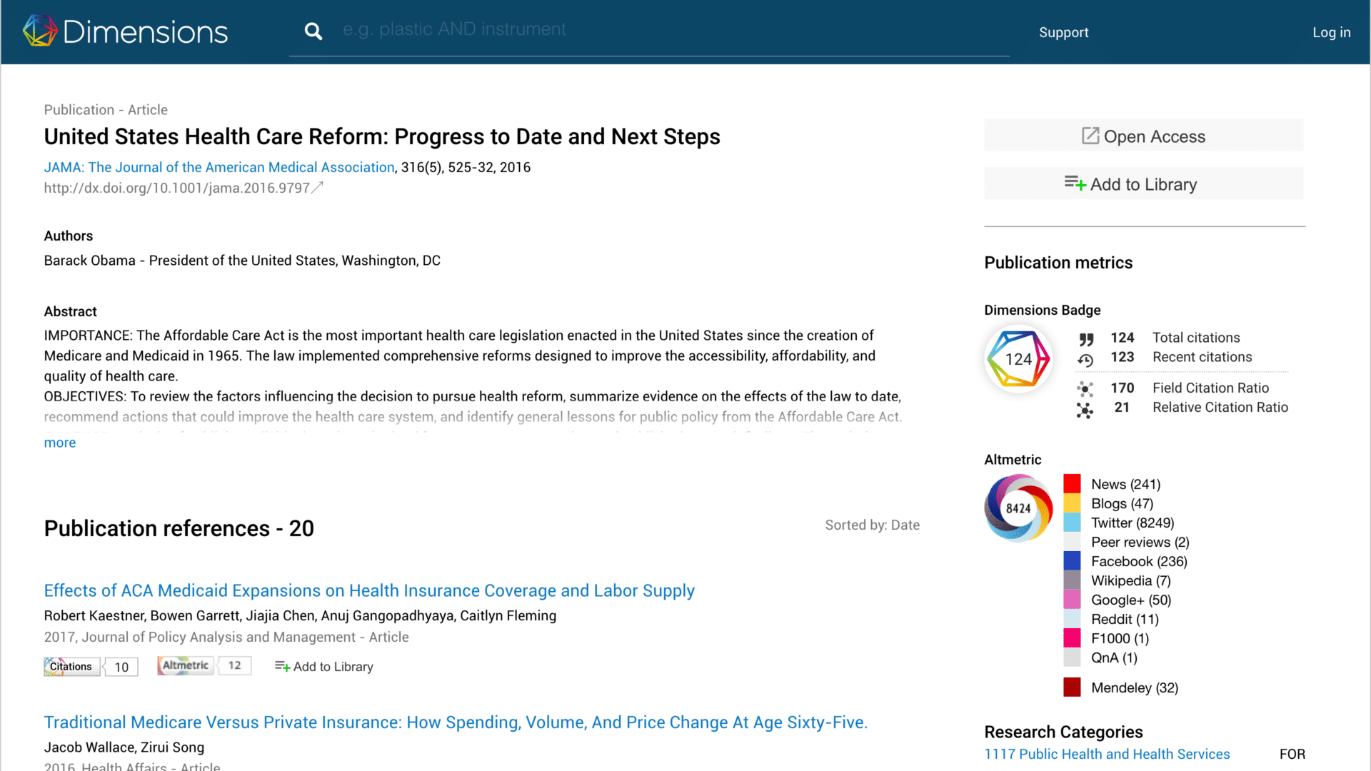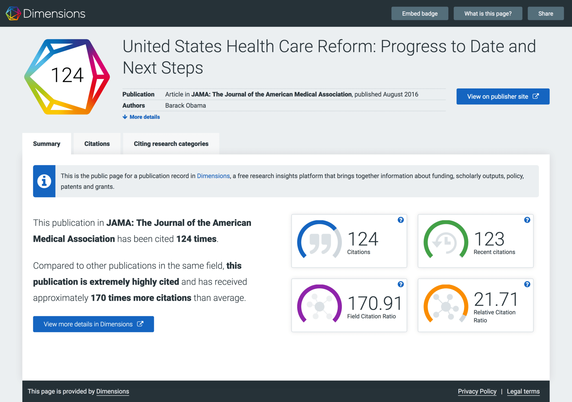 Dimensions Badges can easily be embedded into any webpage with just a simple line of code. The documentation includes a handy “Badge Builder”, which can help users configure the badge appearance and behavior. The badges are free for individual researchers, academic institutional repositories, and certain publishers to use (but terms of commercial use may vary).