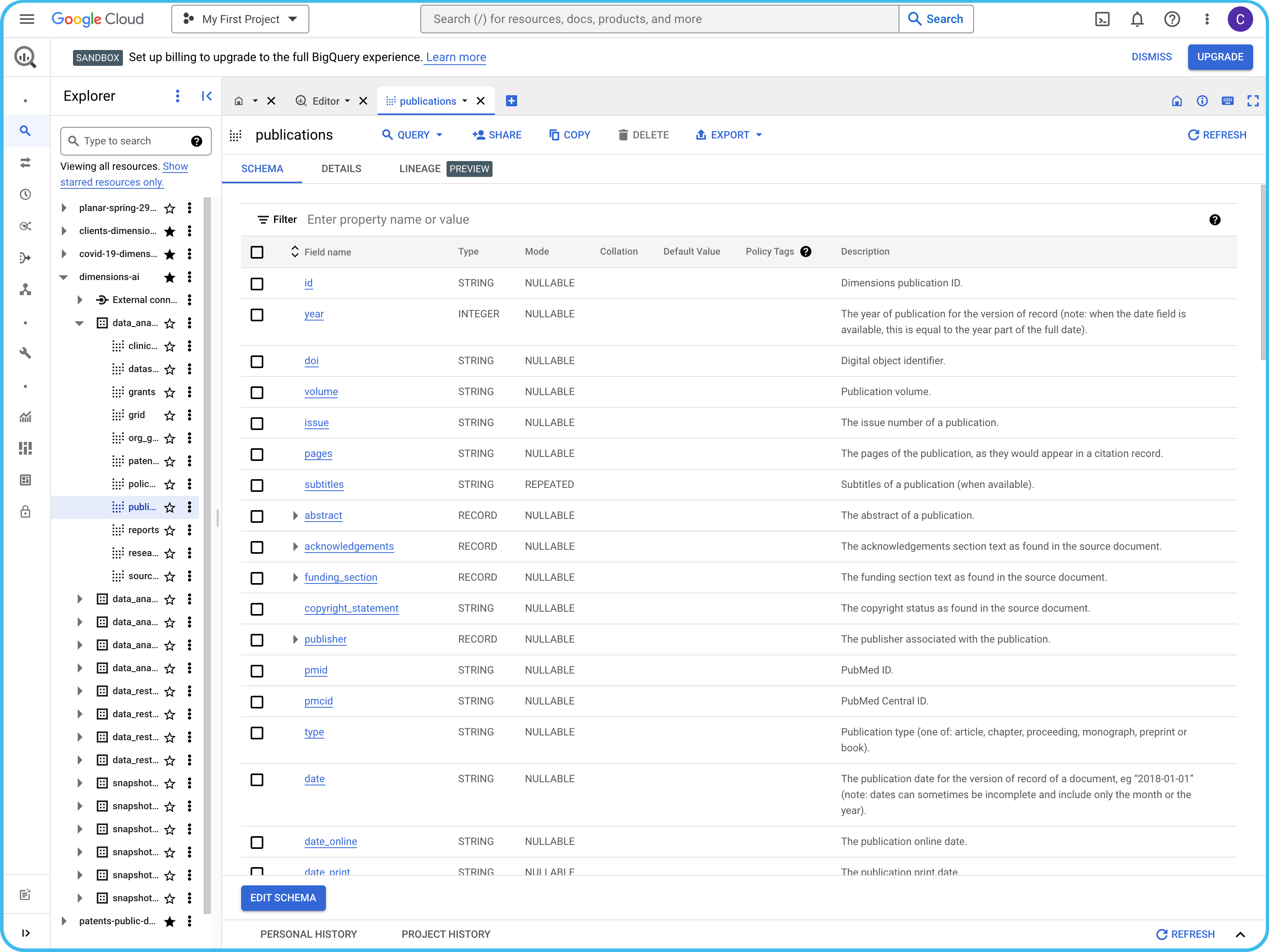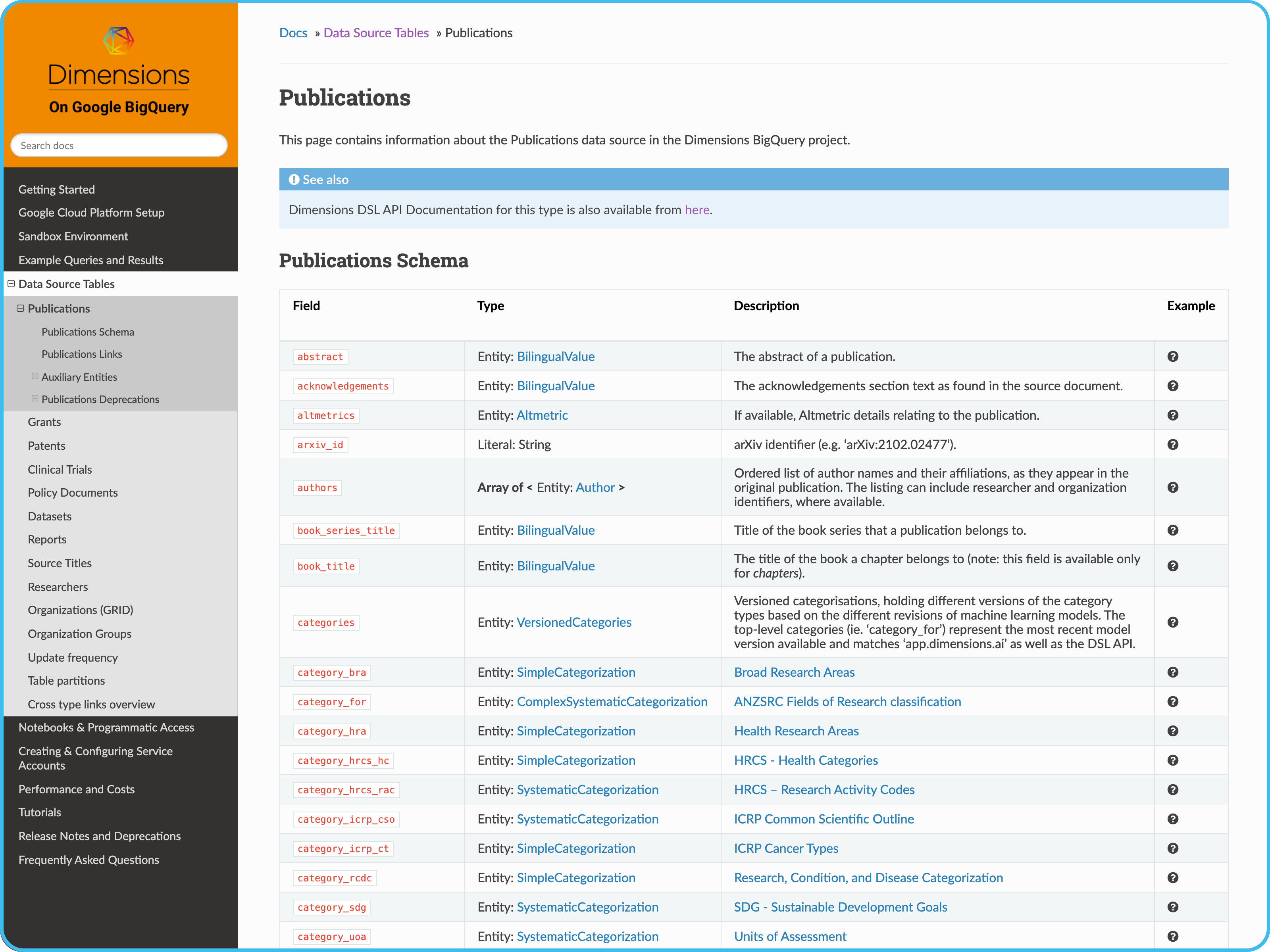With Dimensions GBQ, you can access and combine a diverse range of research data types, including: