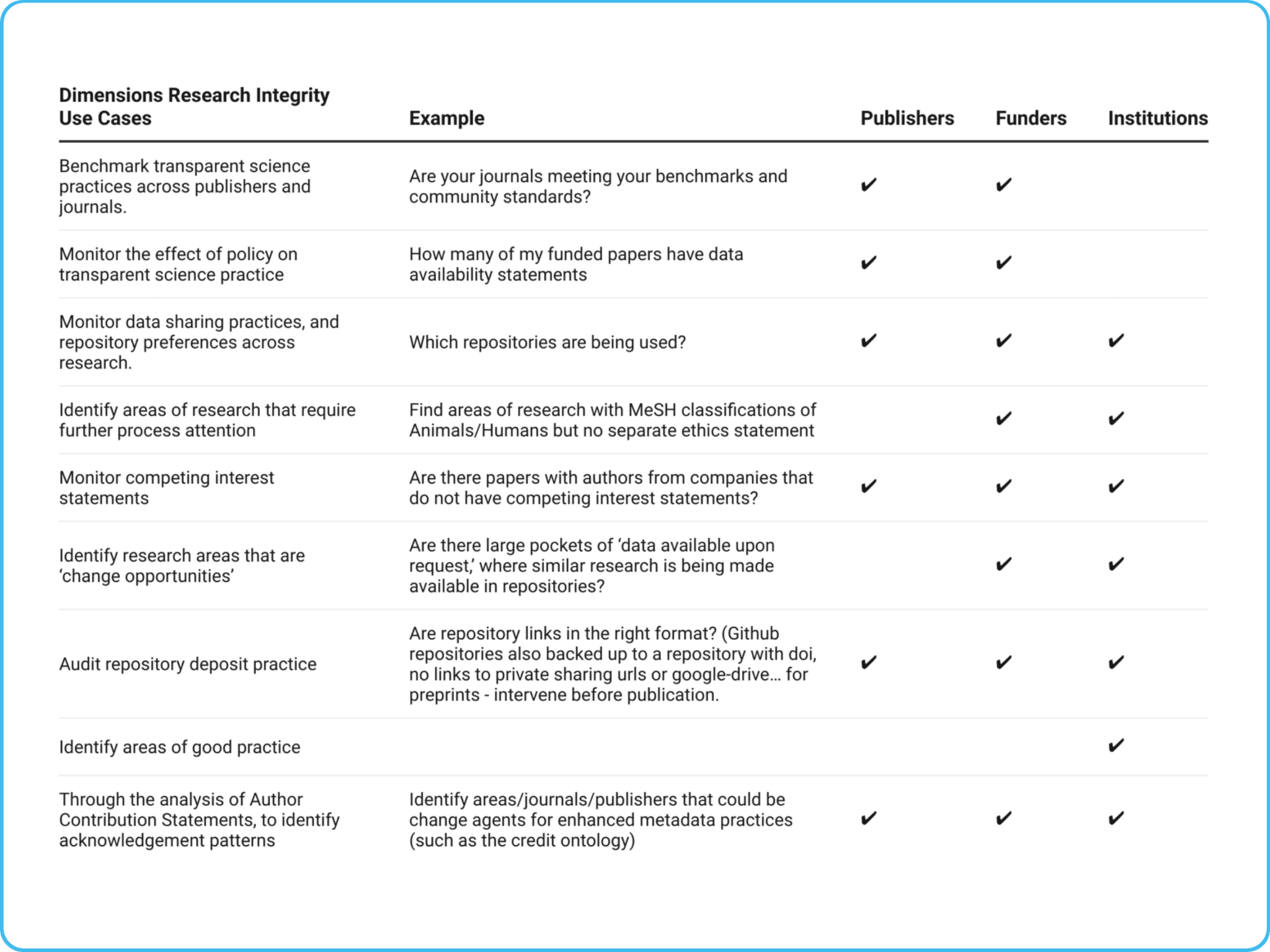 By combining Dimensions data with your internal datasets, you can enhance your capabilities across multiple areas: