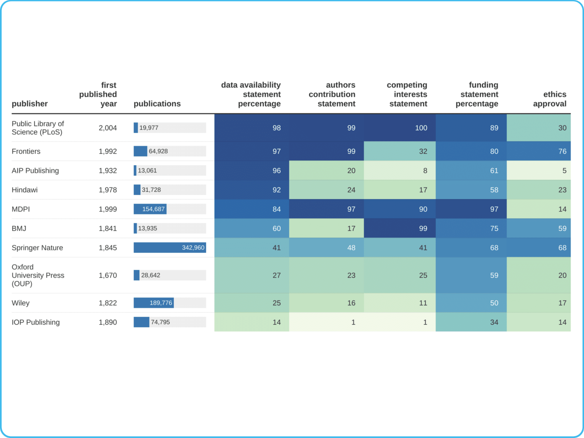 Our big data analysis tool gives you visibility into research integrity with Trust Marker analysis. Explore over 33 million publications collected since 2011, assessing transparency and reproducibility across diverse outputs such as articles, book chapters, conference proceedings and preprints. Trust Markers highlight key elements like data availability statements and competing interest disclosures, helping you: