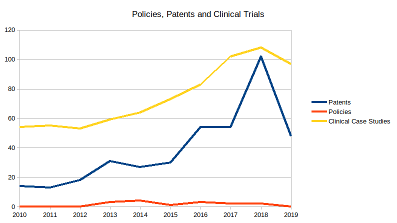 Clinical case studies and patents give a very different picture of the research. Again, let’s contrast this with the relatively small amount of research funding available. The growth in related intellectual property and clinical trials starts in 2012-2013 – about the same time that the discussions about changing the legal status of cannabis start in parts of the US. Clearly, both communities were active in this space beforehand, but equally clearly, the increasingly liberal status of cannabis gave a boost to the research and clinical populations. Both of these data points suggest that grant funding will unlock for this area. Furthermore, it suggests that countries that don’t liberalize their attitudes towards cannabis therapies are likely to fall behind in this field of research.