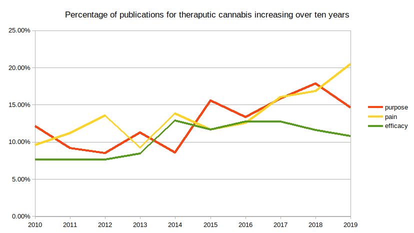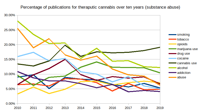 Two really noticeable phenomena can be identified. Firstly, there was a very high frequency of terms that referred to ‘drug use’ or ‘substance abuse’ in the early years: ‘cocaine’ and ‘alcohol’ were particularly dominant. All of these terms have decreased markedly over the decade. Secondly, terms relating to the therapeutic value and use have increased – particularly those publications referring to ‘pain’, which rose from less than 10% of articles in 2010 to over 20% in 2019.