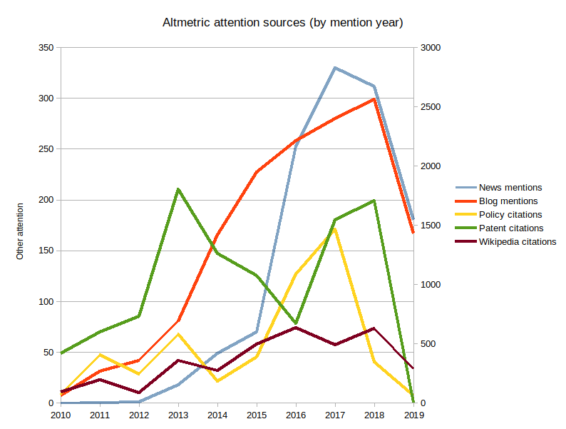 For me, the graph of Altmetric mentions by year and type (shown in Figure 5) really sheds some fascinating insights into the broader impact of this topic: there are a number of trends to bring out.