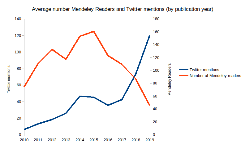 Mendeley Readership grows consistently over time, so typically we’d see a graph decline over time. This graph shows an increasing number of academics saving related research throughout the first half of the decade, despite the relatively slow growth of publications, shown in Figure 2. This suggests that there’s a growing number of academics working in the field. Twitter shows a different trend: that of massive, viral growth in links to related research in 2018 and 2019.