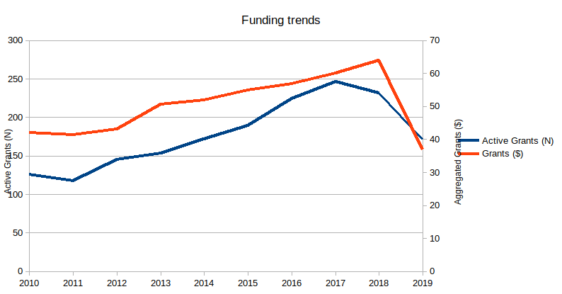 However, if the amount of grant money has only doubled over the decade, the same can’t be said for the rate of publications.