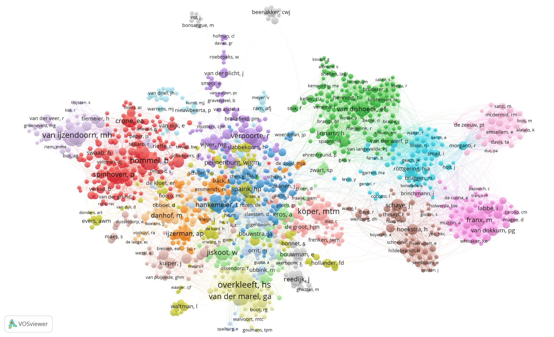 This map shows the network of co-authorship links between 1,218 authors of publications from Leiden University–either by Leiden University researchers or those that have co-authored with them.