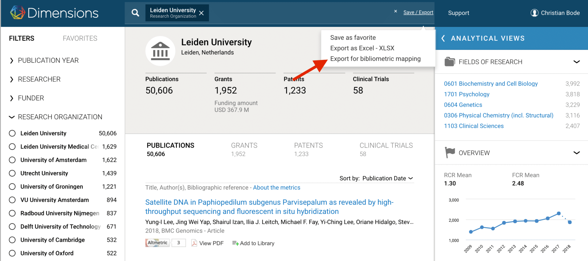 Run a search in any version of Dimensions–the free Dimensions webapp, Dimensions Plus, or Dimensions Analytics–and on the Search Results screen, you’ll have the option to “Export for bibliometric mapping.”