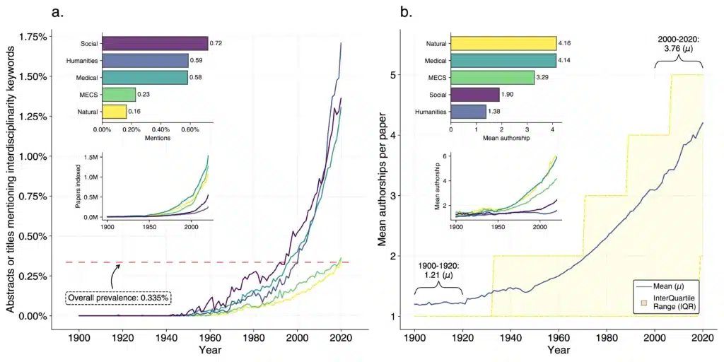 Figure 1: Increasing discussion of interdisciplinarity and growth of academic collaboration over time. Subfigure a. documents, for each broad research area, the prevalence of keywords relating to multi-, inter-, trans-, or cross-disciplinarity over time in the abstracts or titles of publications within the Dimensions corpus. For context, it also provides information on the number of entries indexed by Dimensions for each category (centre left inset). Note: this uses a custom mapping of Dimension’s “Level-2” Fields of Research (FoR, based on ANZSRC, 2008) to broader “Level-1” classifications. “MECS” stands for Mathematics, Engineering, and Computing Sciences. It is possible for single records to have multiple Level-1 categories and thus contribute to multiple trends (approximately 7.5% of records with FoR labels).By-FoR prevalences shown here do not include records which have no FoR assignment (approximately 27% of records). Multiple occurrences of keywords in one record do not inflate the count as there is a maximum count of one per entry (a binary classification). The main part of Subfigure b. shows the overall mean number of authors and the interquartile range (Q75 to Q25). The insets again provide a breakdown by broad research area.