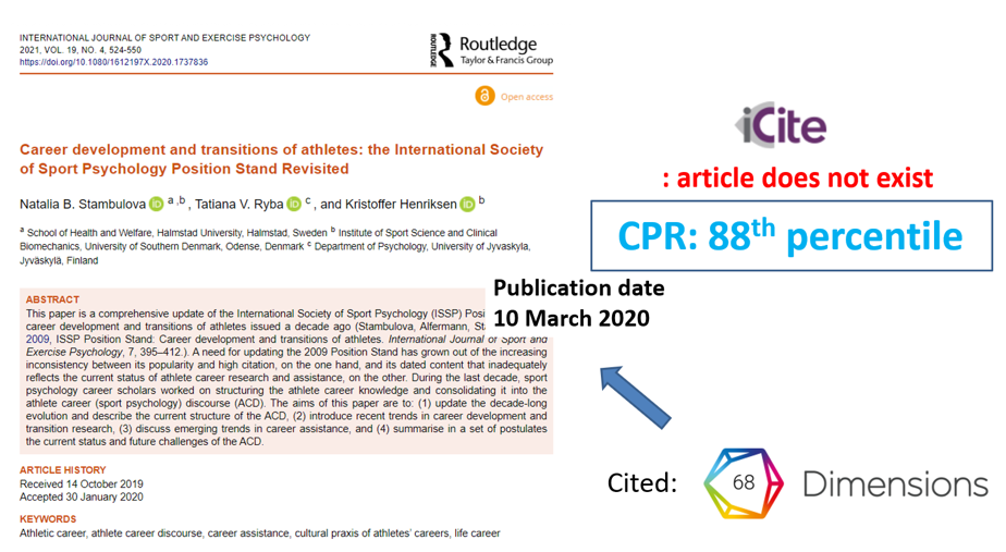 Using the powerful API and search language from Dimensions, Janne developed the Co-Citation Percentile Rank (CPR), which uses Dimensions extensive database, the largest of its kind in the world, to compare the citation rate of any article that has a DOI and is indexed, to the actual citation rates of articles that are co-cited along with that article.