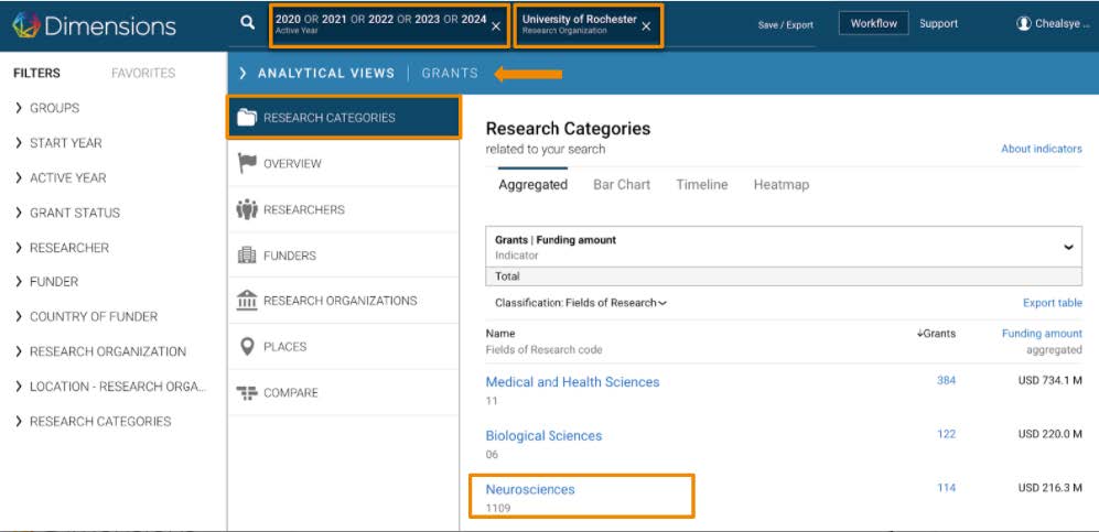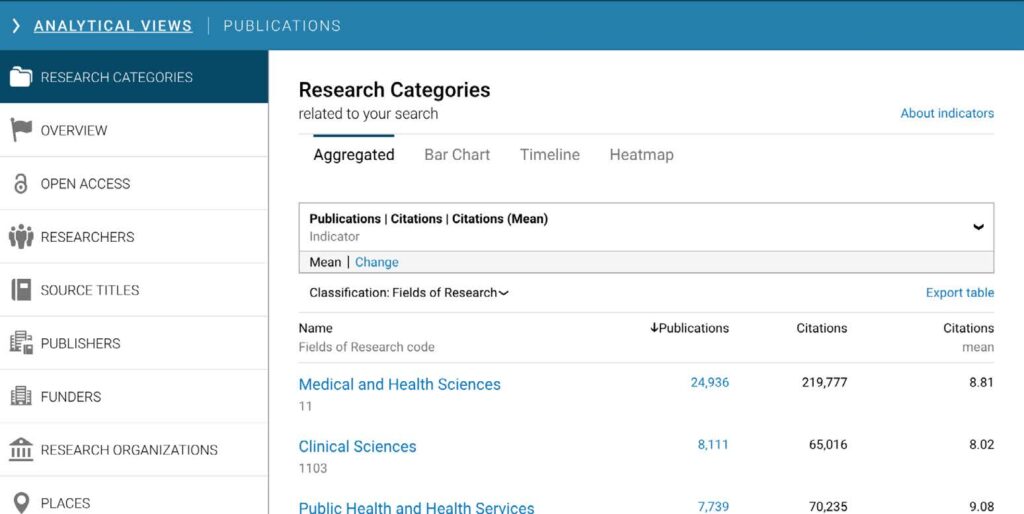 Dimensions’ Analytical Views also allows you to perform detailed analysis of Research Categories (figure 1). You can filter on your institution, select the years you want to include, and begin to understand which research fields your institution is most influential in.