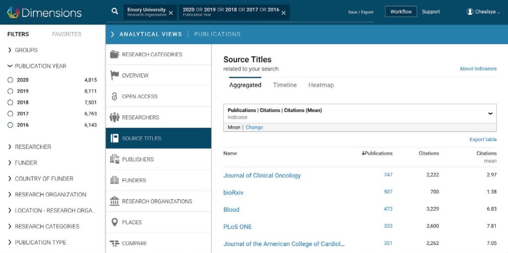 Dimensions provides a variety of routes to analyzing the publication and funding data that can be helpful in making strategic collection development decisions, including: